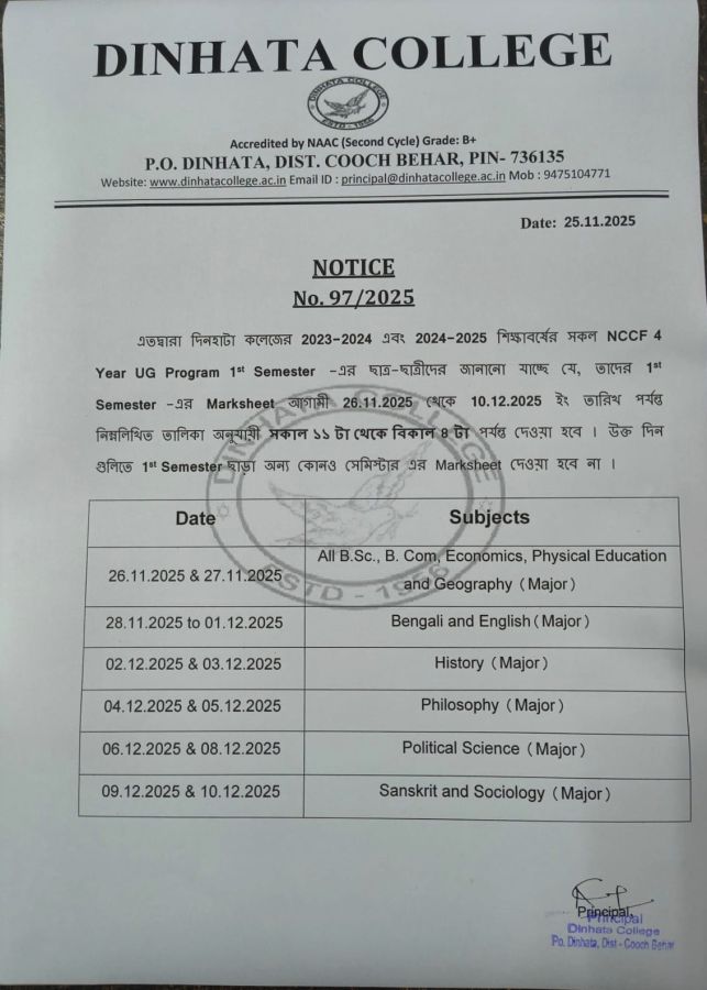 4 YEAR UG NCCF 1st Semester (2023-24 & 2024-25 Session) Marksheet Distribution from 26.11.2025 to 10.12.2025 NOTICE.
