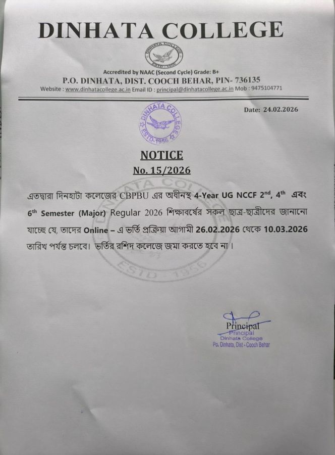 4 Year UG NCCF 2nd, 4th and 6th Semester (Major) Regular 2026 Admission start from 26.02.2026 to 10.03.2026 Notice.