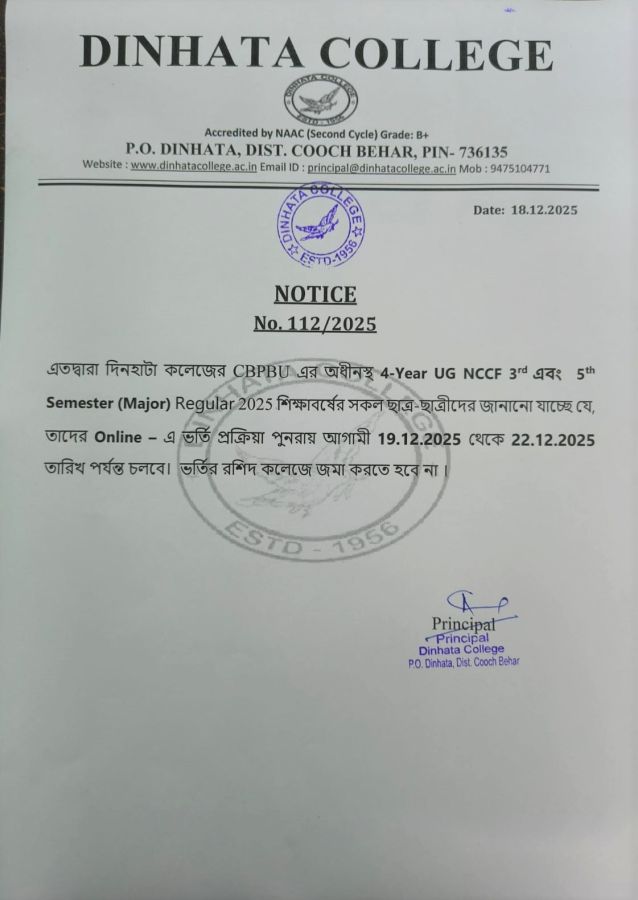 4 Year UG NCCF 3rd & 5th Semester (Major) Regular 2025 admission start from 19.12.2025 to 22.12.2025 Notice.