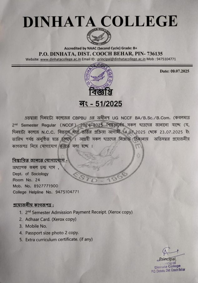 N.C.C Admission for NCCF 2nd Semester B.A./B.Sc./B.Com.