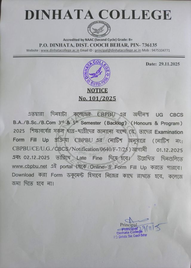 UG CBCS 3rd & 5th Semester Backlog (Hons. & Prog.) Examination Form Fillup with Late Fine 01.12.2025 and 02.12.2025 Notice.