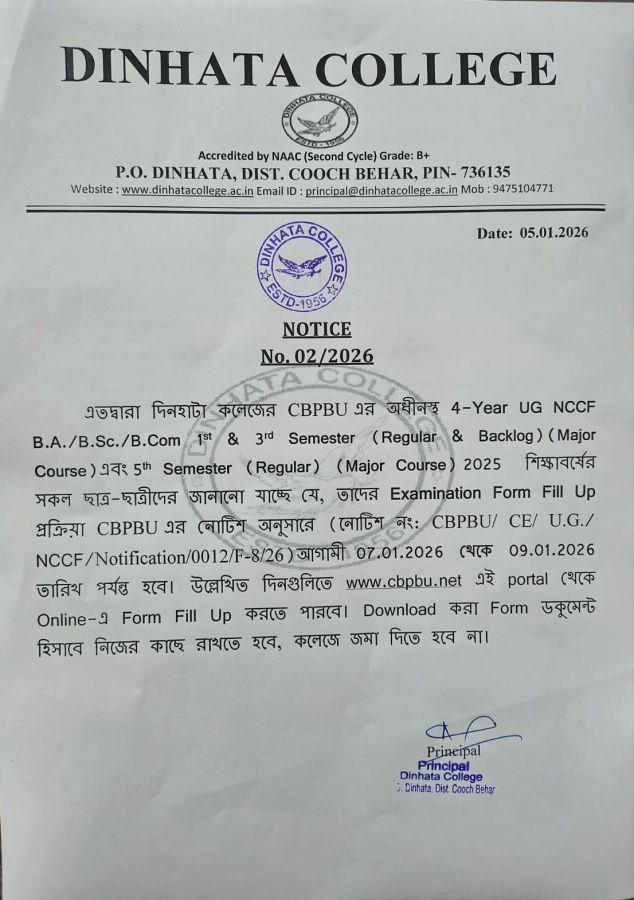 UG NCCF B.A./B.Sc./B.Com. 1st Semester & 3rd Semester (Regular & Backlog), 5th Semester (Regular) Exam Form Fill up With Late Fine start from 07.01.2026 to 09.01.2026 Notice.