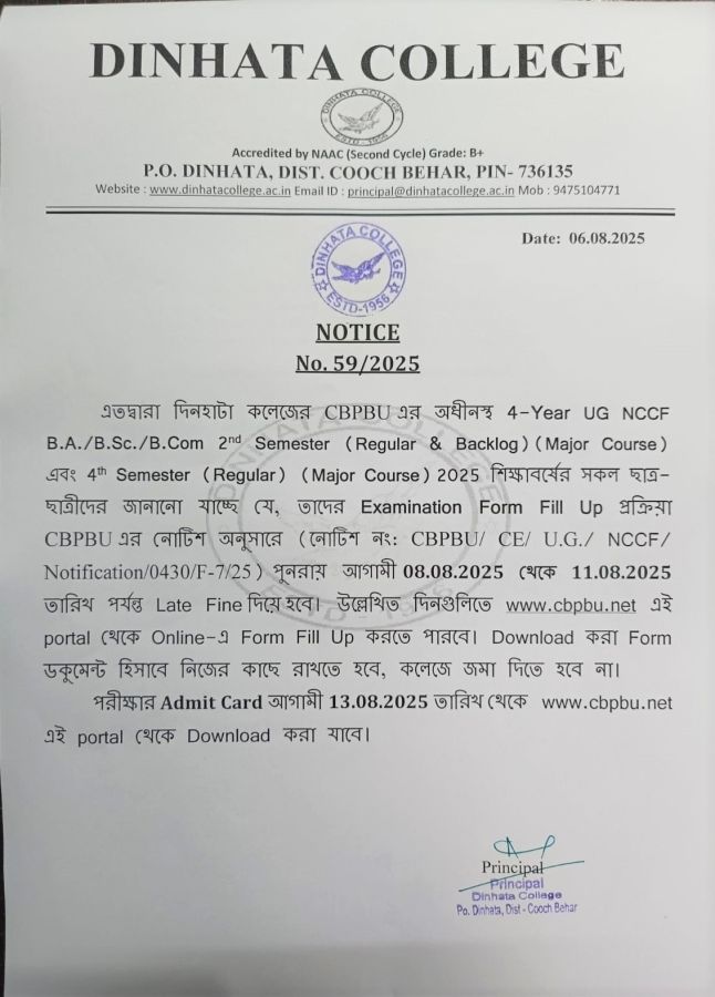UG NCCF B.A./B.Sc./B.Com. 2nd Semester (Regular & Backlog), 4th Semester (Regular) Exam Form Fill up with Late Fine start from 08.08.2025 to 11.08.2025.